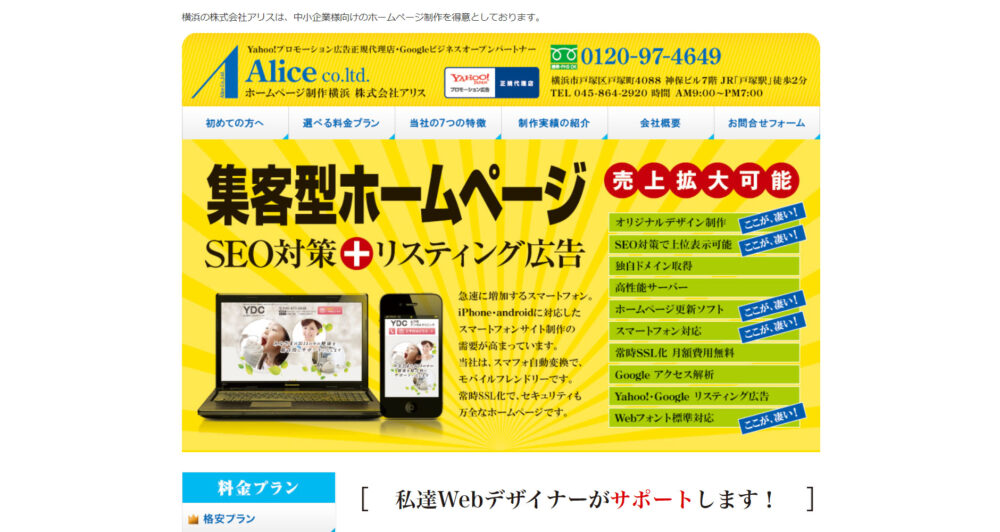 株式会社アリスは横浜市のホームページ制作会社で、横浜市を中心に全国各地から依頼があります。不動産業や医療機関など幅広い業種で、これまでに1,200以上の豊富な制作実績を重ねてきました。