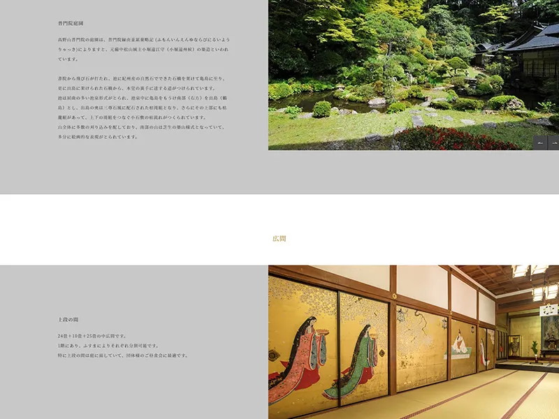 Works home>Works>別格本山様【宿坊普門院】 別格本山様【宿坊普門院】 事業内容: 制作 企画構成デザインコーディングレスポンシブスマートフォン https://www.fumonin.net/ Comment 和歌山高野山で宿坊を営んでおられる普門院様のWEBサイトをリニューアル制作させていただきました。 長い歴史を感じる厳かな寺院というイメージで黒や白、ロゴの色にちなんだゴールドを使用しました。 写真撮影も弊社で行い、普門院様の魅力をより感じてもらえるよう、各ページにスライドショーを配置しました。 外国の方もたくさん訪れるということで、英語サイトの制作もしております。 レスポンシブ/リキッドデザインで、PC・タブレット・スマートフォンで表示が切り替わります。 制作実績の一覧へ戻る Contact us